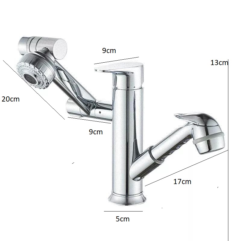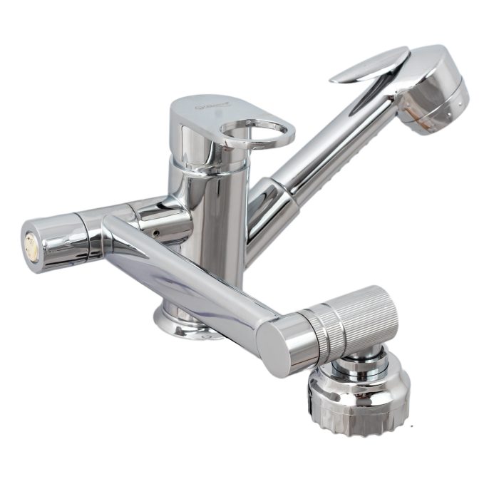 Para dus extractabila – cu parghie de actionare a jetului de apa are un inportatnt rol in spalarea obiectelor din afara zonei chiuvetei. Furtunul de dus poate fi extras pana la 120cm, dupa utilizare acesta revine in soclul special conceput .