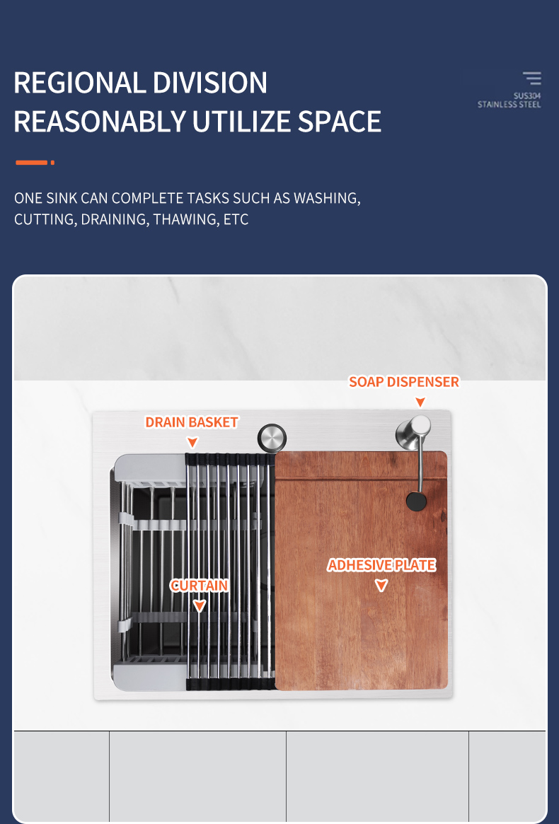 Descoperă o chiuvetă multifuncțională premium realizată din oțel inoxidabil SUS304, ideală pentru bucătăriile moderne. Cu un design inteligent și eficient, această chiuvetă este dotată cu: