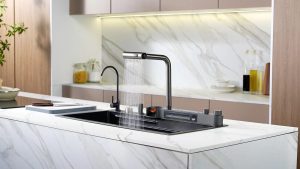 - Apă filtrată: Această baterie dedicată furnizării de apă potabilă este fabricată din inox satinat, oferind un flux separat de apă filtrată pentru consum direct.