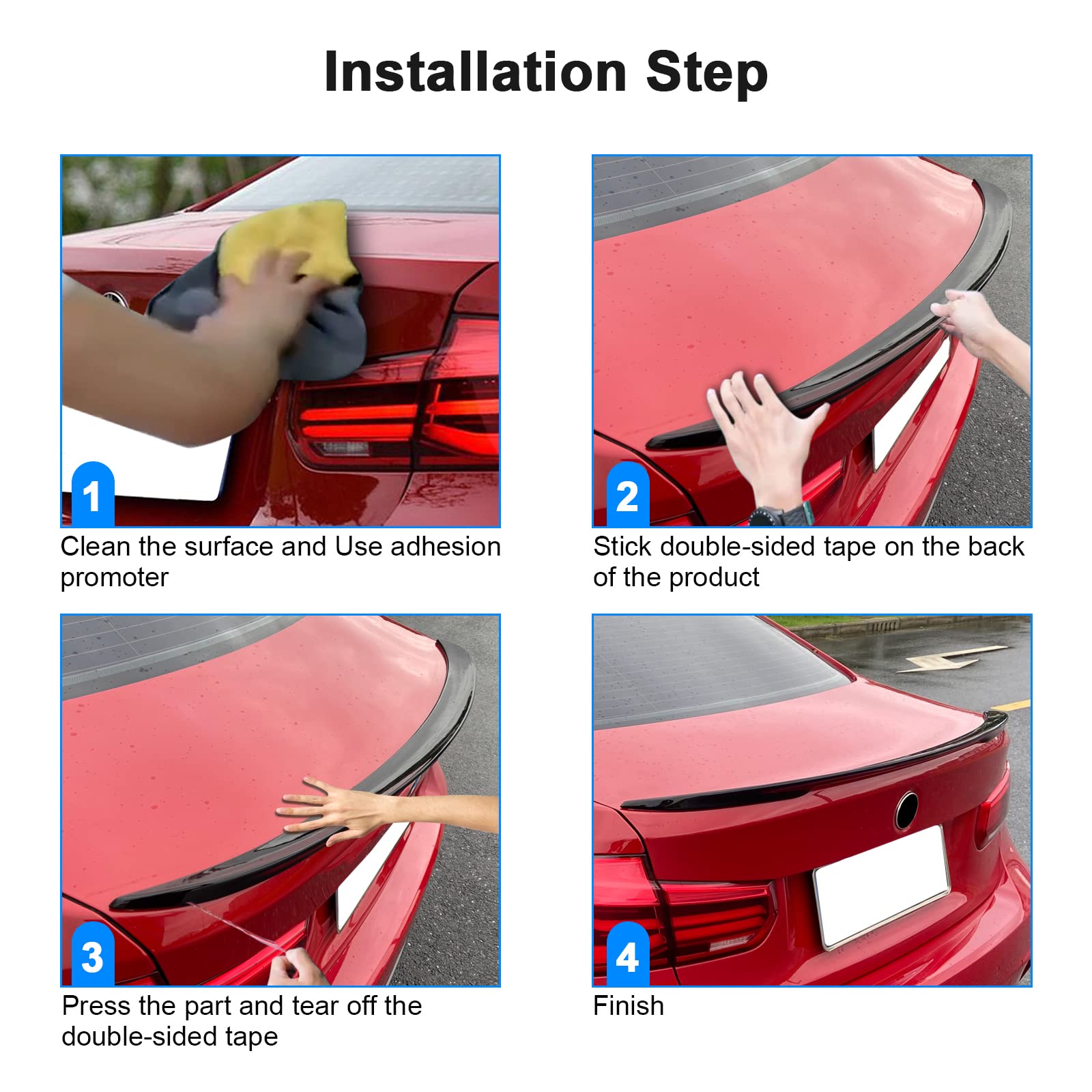 Montajul este rapid și sigur, realizându-se cu bandă dublu-adezivă auto inclusă, fără găurire sau modificări permanente ale caroseriei. Instalarea poate fi efectuată ușor chiar și fără experiență tehnică.
