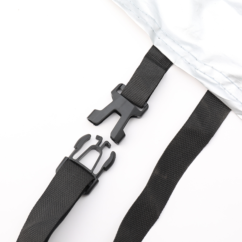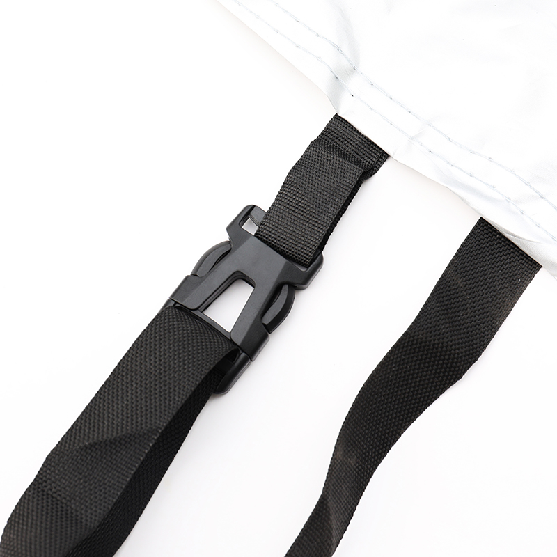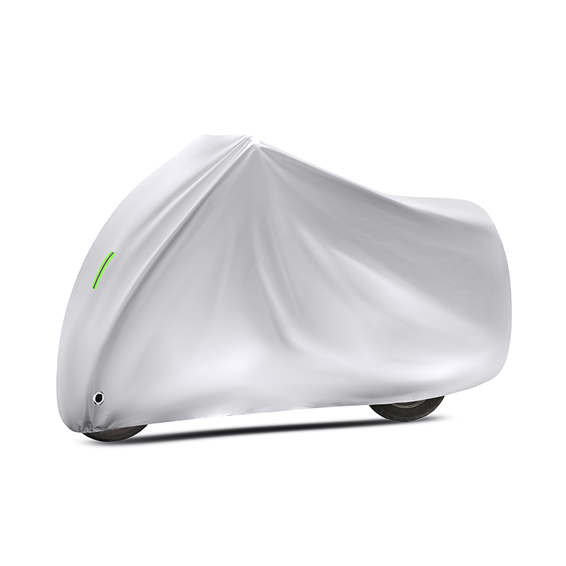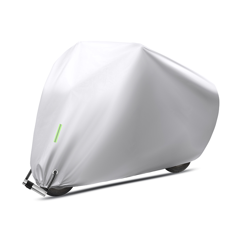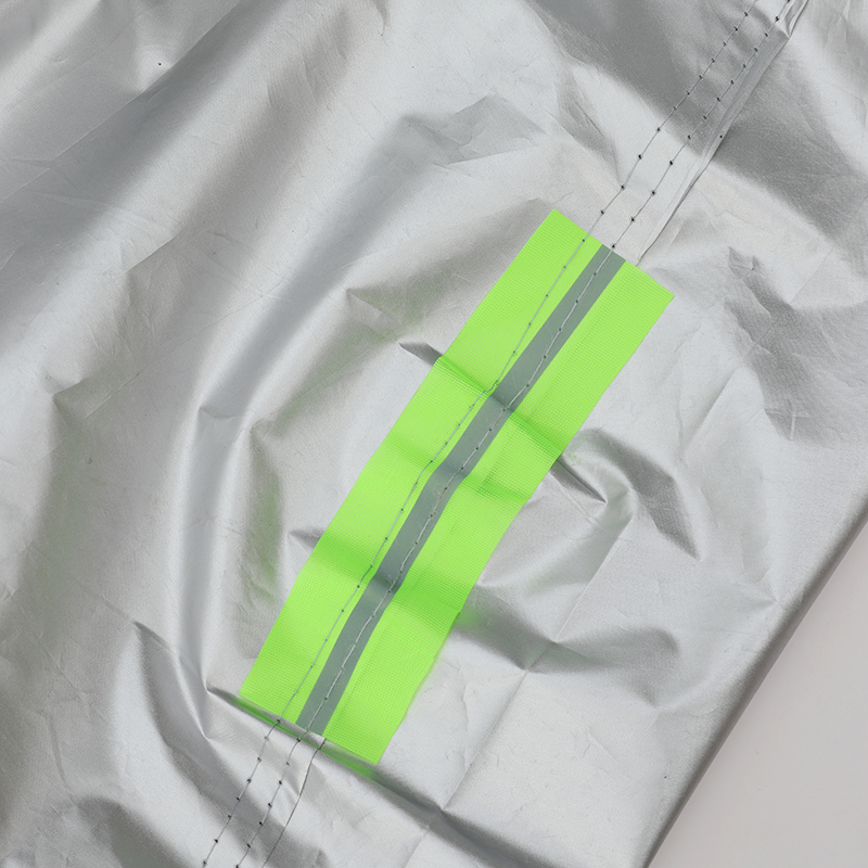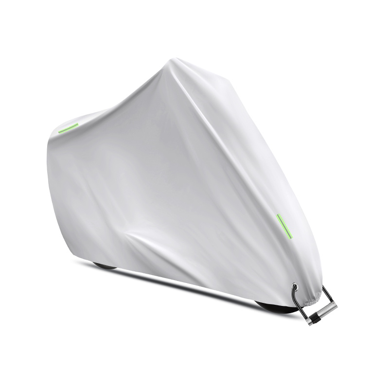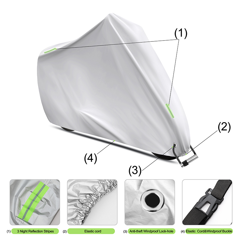 Husa este prevăzută cu benzi reflectorizante verzi pentru vizibilitate pe timp de noapte, margini elastice pentru fixare sigură, orificiu antifurt compatibil cu lacăt, precum și curea cu cataramă reglabilă care previne ridicarea de vânt.