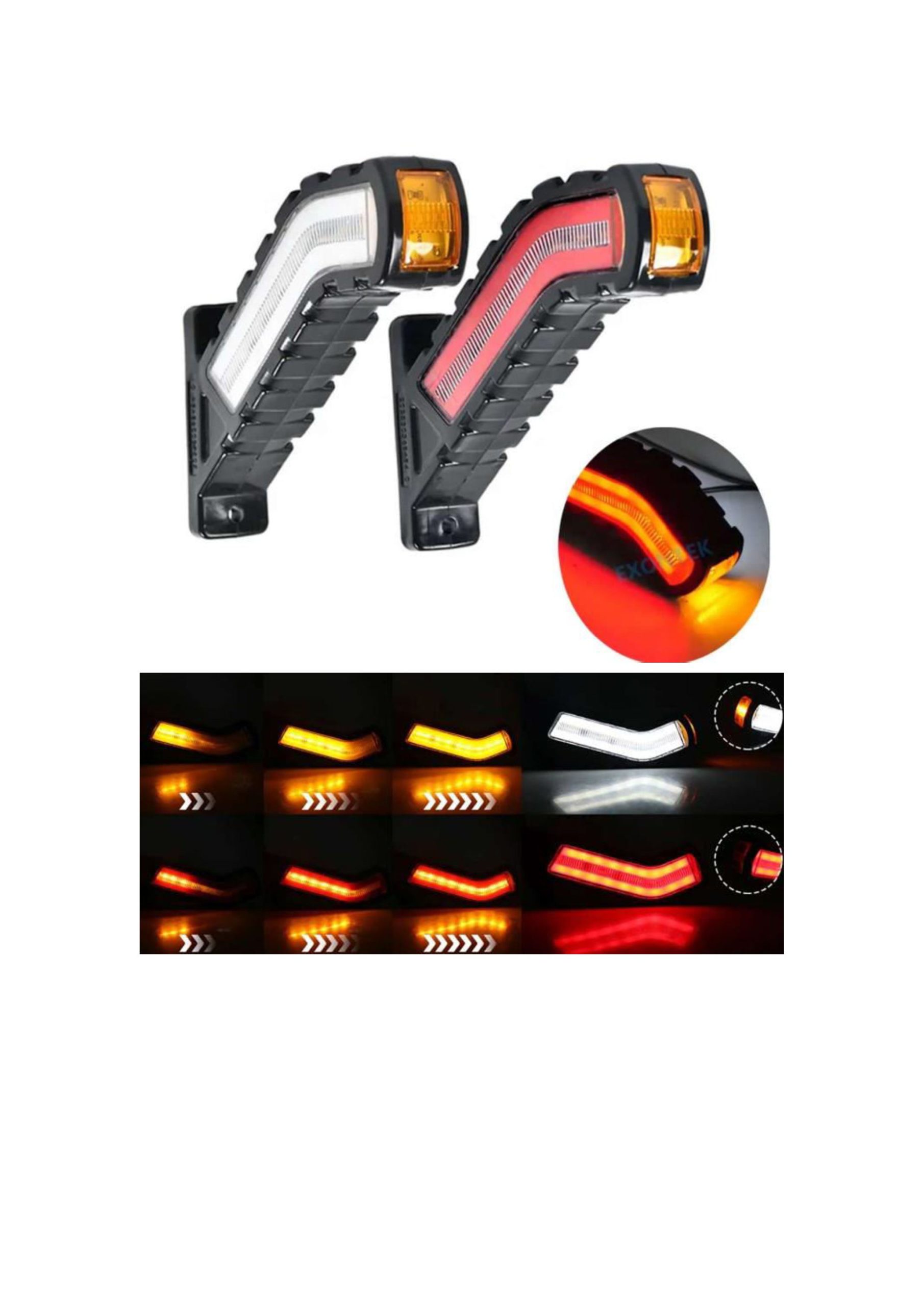 Lampă LED multifuncțională pentru semnalizare laterală și spate, ideală pentru camioane, remorci și vehicule comerciale grele. Designul curbat, în unghi, asigură o vizibilitate maximă din toate unghiurile, iar semnalizarea dinamică „cascadă” oferă un plus de siguranță și estetică modernă.