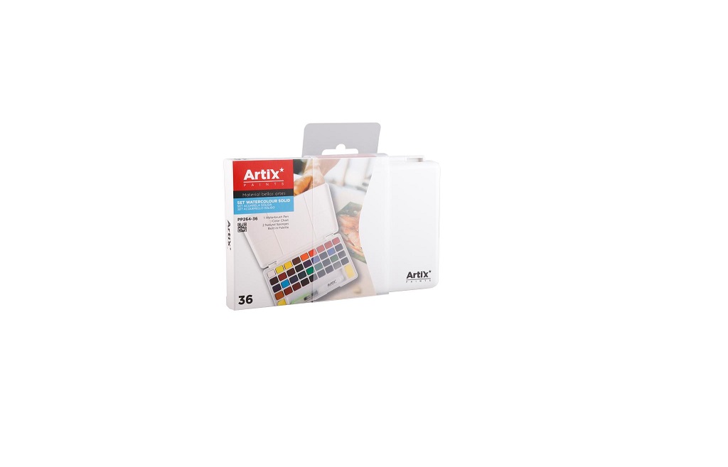 Paleta acuarele cu vopsea solida, 36 culori, burete si pensula cu rezervor de apa