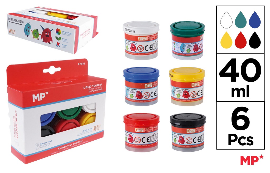 Scoala lichida TÉMPERA. Gata de plecare si potrivita pentru uz prescolar. Culorile pot fi amestecate intre ele, extinzand gama de culori. Poate fi folosit pe hartie, carton, lemn, tesatura, lut, pasta de modelat… Culori vii si acoperire excelenta. Flacon de 40 ml.6 culori.