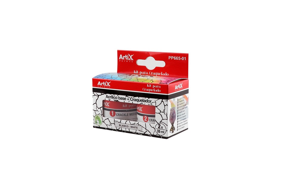 Vopsea sa trosneasca si da efectul invechit si crapat pe lemn, ipsos, ceramica, carton, chiar si sticla. Vine intr-o trusa cu un lac cu trosnire medie si un al doilea lac acrilic crospat colorat. Foarte usor de folosit: prima vopsea cu vopsea acrilica Artix; al 2-lea se lasa sa se usuce; In al treilea rand se aplica biscuitul mediu; al 4-lea se lasa sa se usuce; Al 5-lea aplicati crackerul acrilic. Kit crackle mediu + crackle acrilic in borcane de 35 ml. Culoare alba.