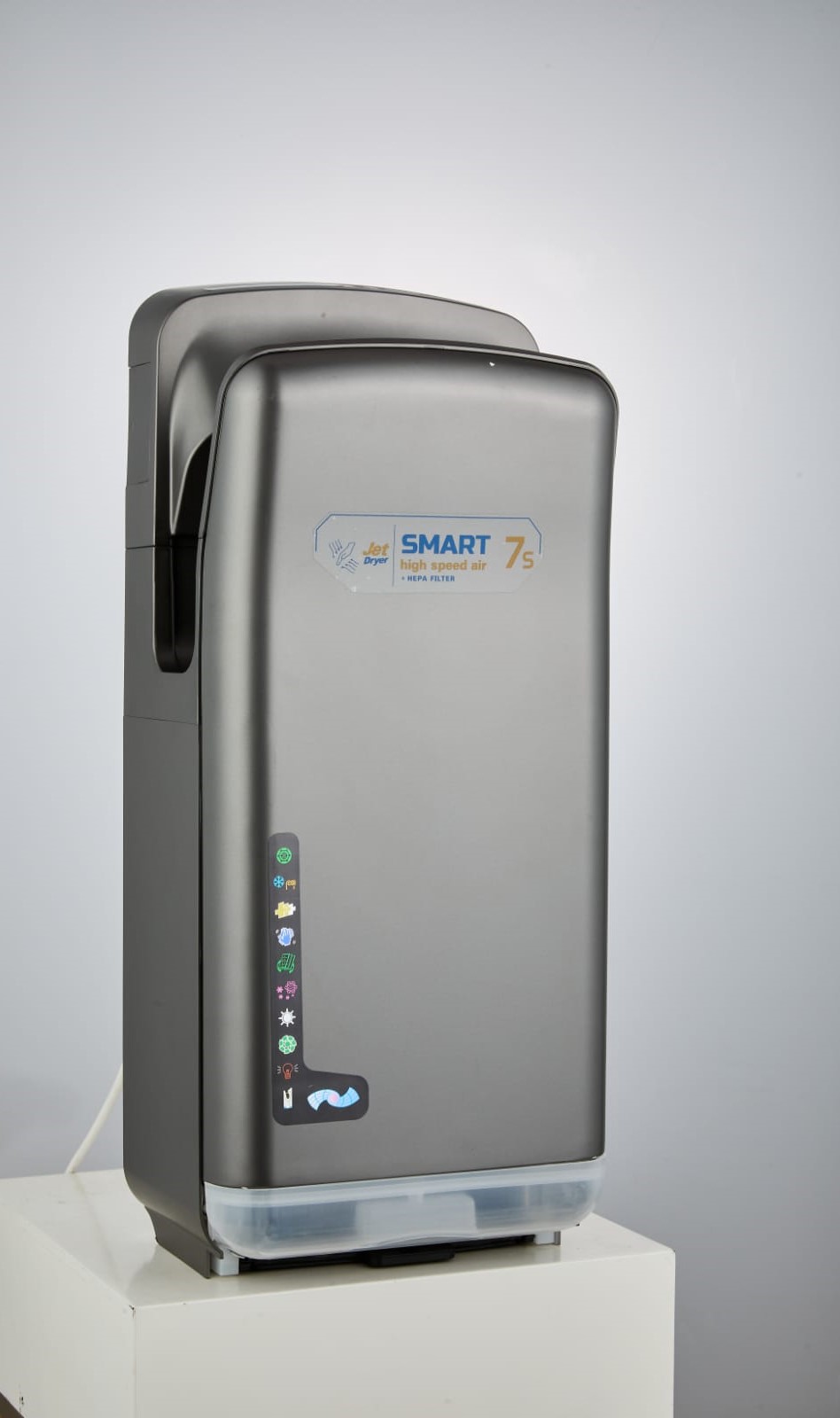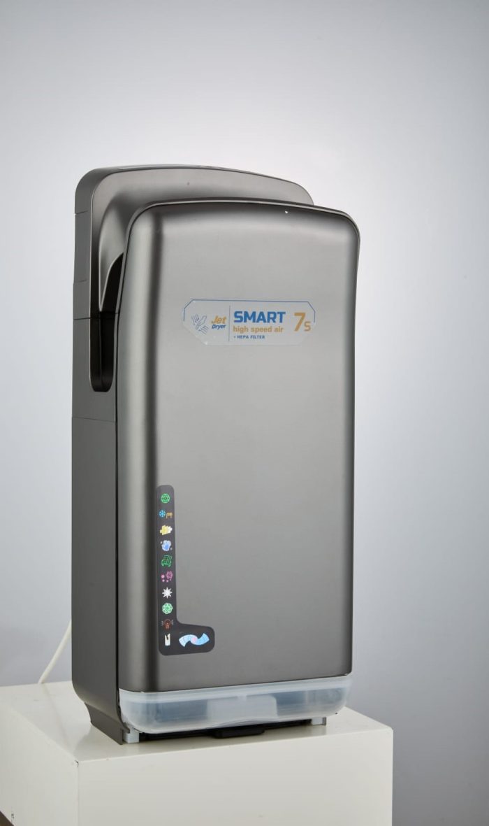 - Uscătorul este echipat cu un filtru HEPA care captează praful și alte impurități din aer, asigurând că aerul ce atinge mâinile este curat. Această caracteristică este esențială pentru igiena suplimentară, în special în spațiile publice.